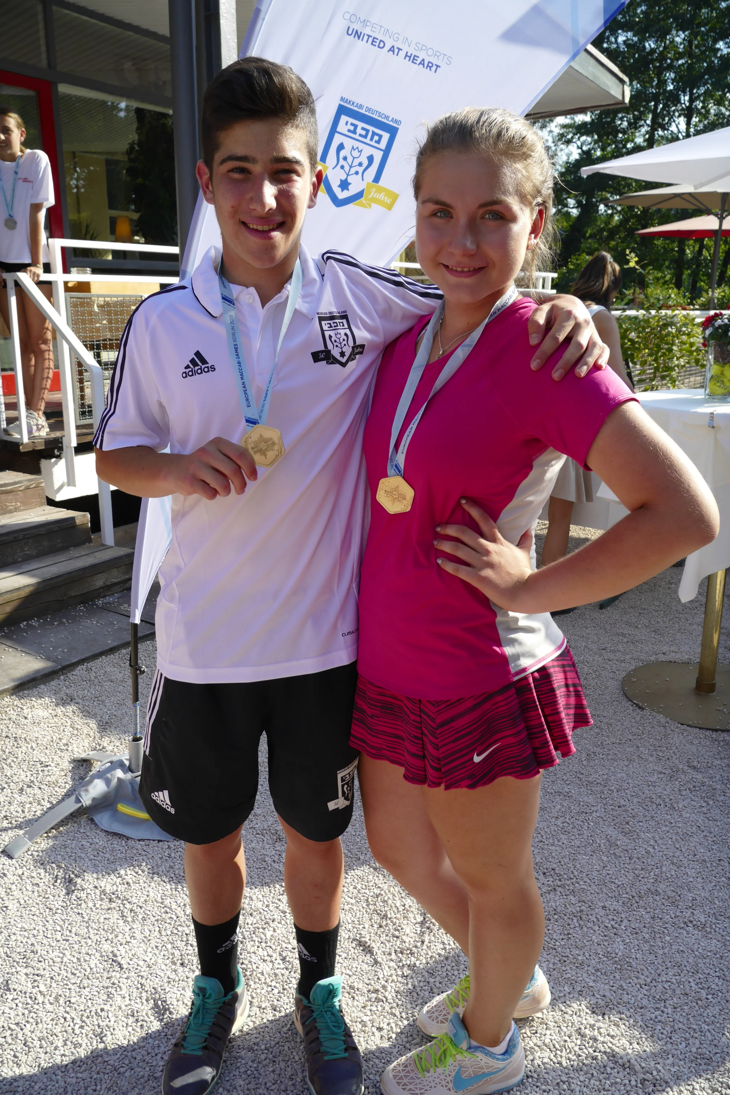 Die ganze vergangene Woche vertrat Mark Kolodizner Makkabi Deutschland bei den European Makkabi Games (EMG) Junior U18 Tennis Wettbewerb. Im Rahmen der 14. European Makkabi Games 2015 kämpfen 200 Athleten aus 22 Ländern im blitzblanken Steffi Graf Stadion und auf den 16 penibel gepflegten Sandplätzen des LTTC Rot-Weiß Berlin um den Sieg. Heute gewann Mark zusammen mit Michele Kovalenko (LTTC Rot-Weiß) das Finale um die Goldmedaille bei dem Juniors U18 Mixed Wettbewerb souverän mit 9/5 gegen das türkische Duo Gulman/Eschkenazi.