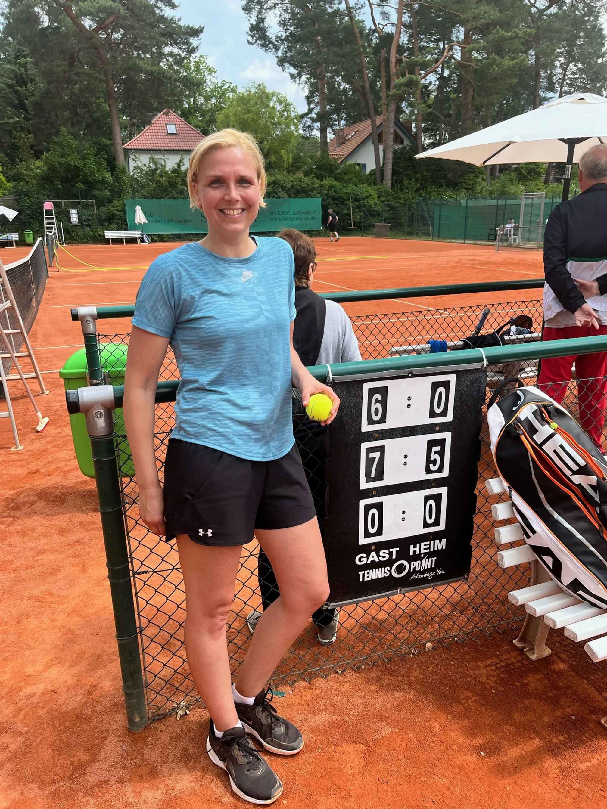 Unser erstes Spiel haben wir gegen Greifswald 5:4 trotz Verletzung von Detlef Goericke gewonnen. Danach spielten wir am 18.05.22 zu Hause gegen Grün-Gold Tempelhof, alles alte Bekannte mit jeweils durchgängig besseren LK Einstufungen als wir. Im letzten Jahr hatten wir 3:6 verloren. Nach der ersten Runde mit Winfried Turowski (2), Jörg Venus (4) und Axel Jager (6), sah es auch gar nicht gut aus: erster Zwischenstand 0:3. Jörg musste verletzt aufgeben. Unser Newcomer Axel schlug sich tapfer, unterlag aber im Matchtiebreak.