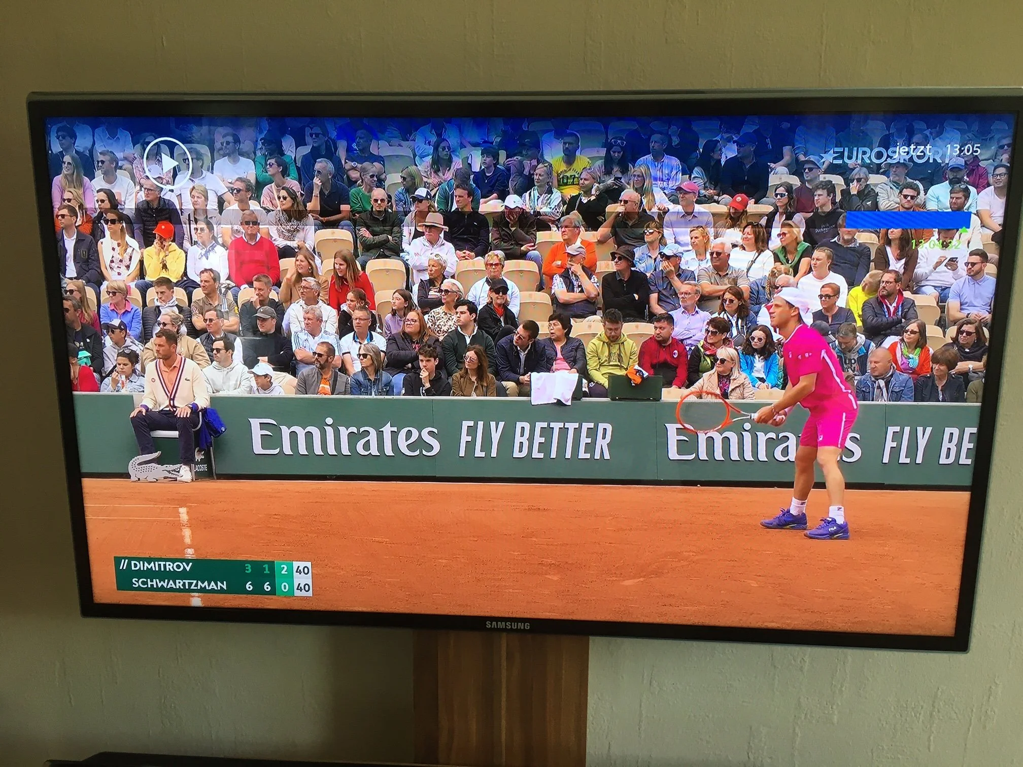 Wir hatten super Plätze, fast ganz vorne, und waren des öfteren im Fernsehen zu sehen, wenn die Spieler/innen zu ihren Handtüchern gingen (siehe Suchbild unten).
