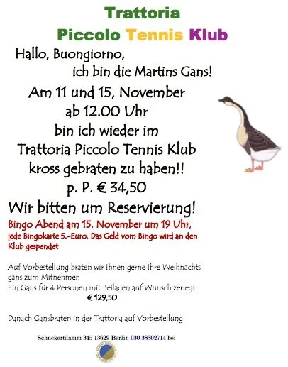 Auf diese Weise musikalisch festlich eingestimmt, bietet es sich doch an, anschließend im Tennis-Klub noch zum Gänseessen zu kommen. Gegen 19:00 Uhr wird Adelmino dann die Gänse schon knusprig kross gebraten vorbereitet haben und den passenden Rotwein bereitstellen. Bitte unbedingt vorab reservieren.
